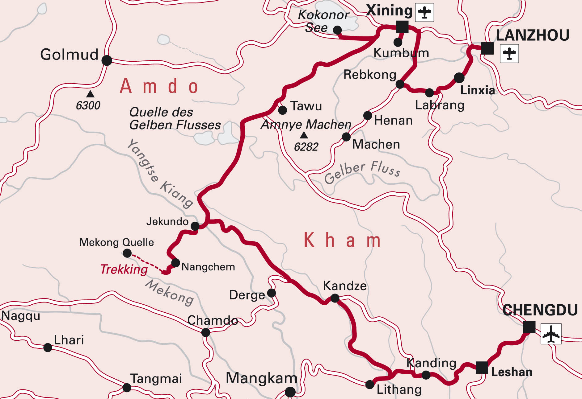 1./2. Tag: Flug nach Peking 3. Tag: Flug nach Lanzhou, Fahrt nach Labrang 4. Tag: Besichtigung des Kloster Labrang 5. Tag: Fahrt auf nach Rebkong (Chin. Tongren) 6. Tag: Besichtigungen in Rebkong 7. Tag: Fahrt nach Kumbum 8. Tag: Besichtigungen in Kumbum , Nachmittag Fahrt zum Kokonor See 9./10. Tag: Fahrt nach Jekundo (Chin. Yushu) 11.-18. Tag: Expedition zum Quellgebiet des Mekong 19.-21. Tag: Teilnahme am Nomaden-/Reitfest und Besuch der verschiednen Klöster um Jyekundo 22.-25. Tag: Fahrt auf dem „Kham-Amdo Highway“ nach Litang 26. Tag: Besuch der verschiedenen Klöster um Litang 27./28. Tag: Fahrt via Kangding nach Chengdu 29. Tag: Flug nach Peking 30. Tag: Rückflug