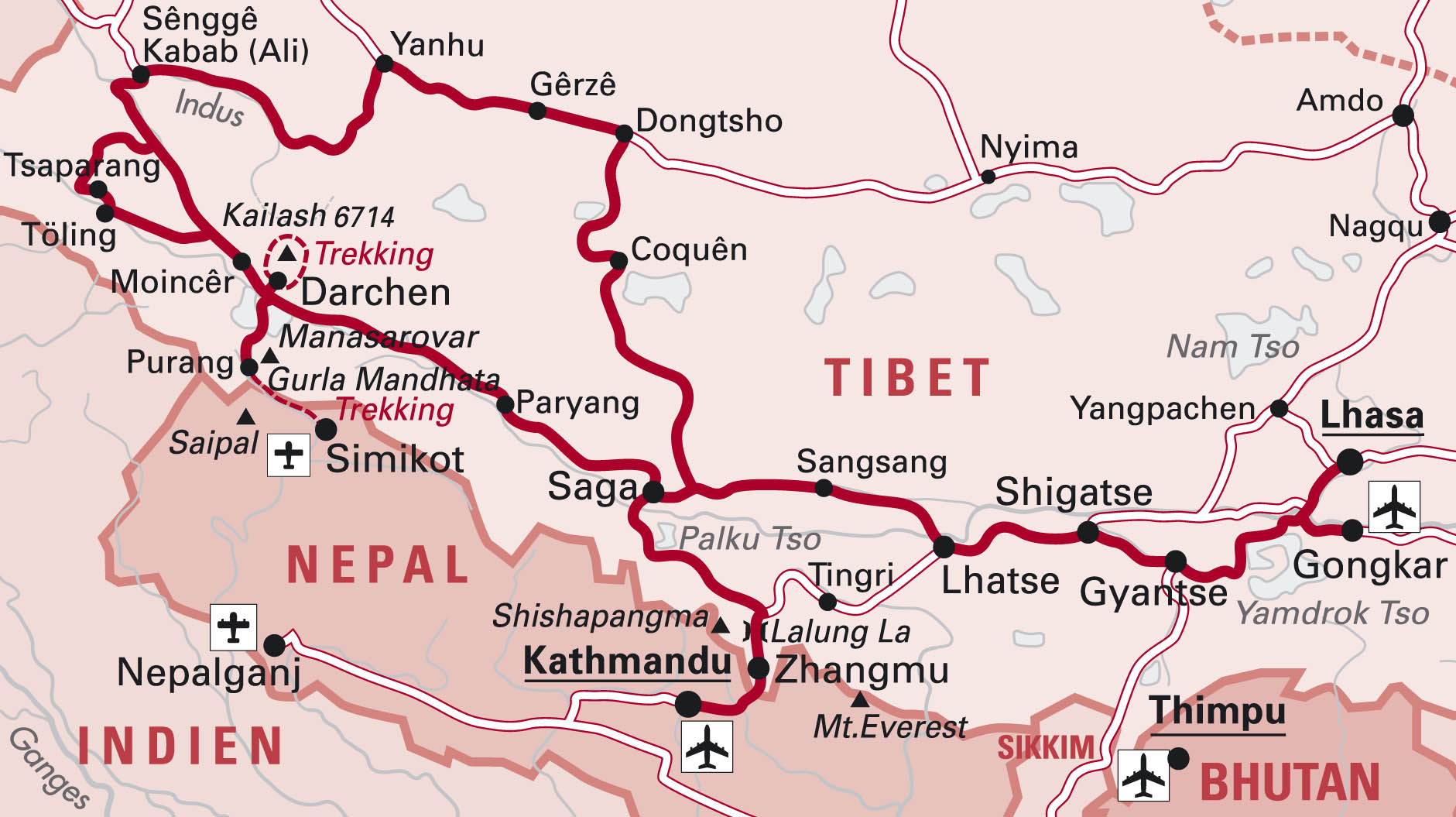 Eine Reise zum Mt. Kailash gehört zu den eindrücklichsten Erlebnissen. Sie bewegen sich auf Höhen bis 5600m ü.M., was eine gute Kondition und einen gesunden Kreislauf erfordert. Die Überlandfahrten sind lang und die Strassen entsprechen nicht immer unseren westlichen Vorstellungen. Diese Reise hat Expeditionscharakter und verlangt von allen TeilnehmerInnen Flexibilität, Toleranz und Teamgeist.